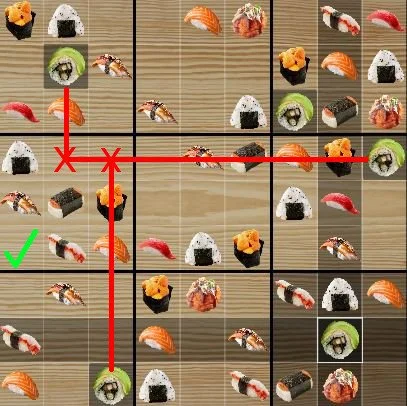 - Don't just look for spaces, use the items on the board (clues) to determine what rows and columns are already used by a given sushi.